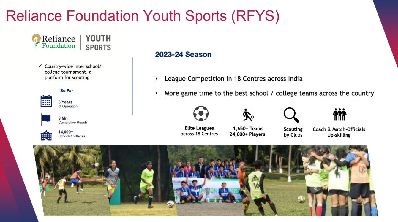 Reliance Foundation Youth Sports is a country-wide, platform for school and college student athletes, aiming aims to broaden the reach of sports. It also supports development of sporting infrastructure in schools and provides free training to PE teachers.